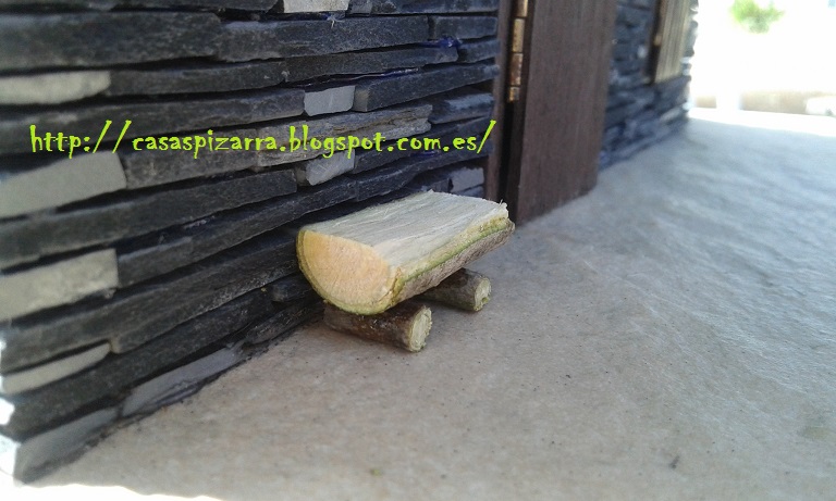 Por último otro detalle que suelo colocar en mis casinas es un asiento, lo podéis ver en la siguiente foto, es un trozo de madera de olivo sobre otros dos trozos de rama más finos de olivo.